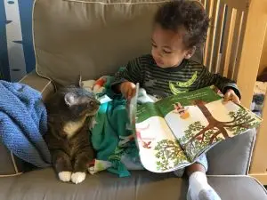 Heading into the 2-3-year-old year, children will start pointing out familiar images they know. “Cat” while pointing to a picture of a cat. They may begin repeating phrases they remember from the book; “I think I can, I think I can…” All of these are different ways to read at this developmental level!
